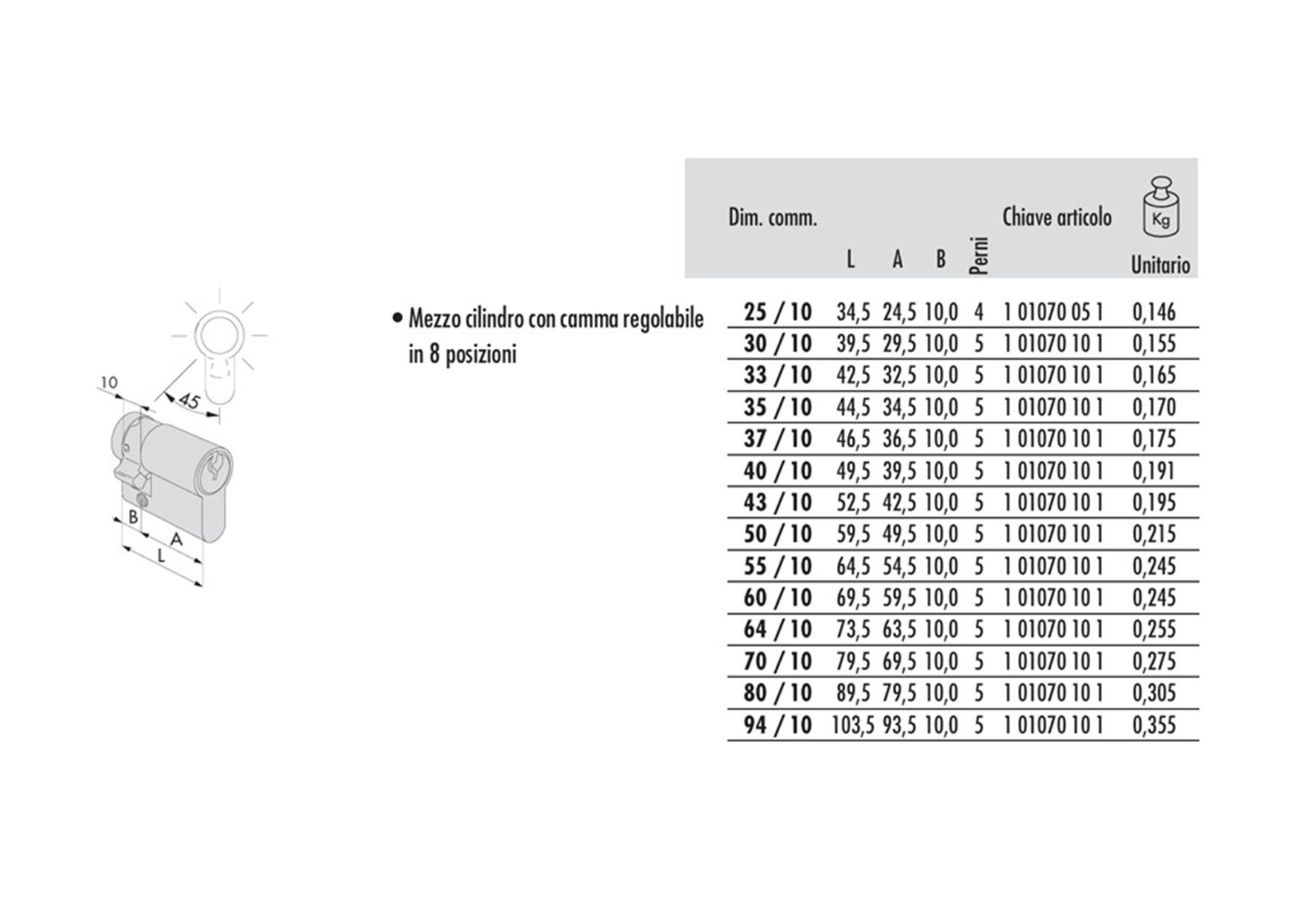 Mezzi cilindri profilo europeo da infilare in ottone. Camma sporgente e regolabile in 8 posizioni. 5 perni e 3 chiavi. Corpo e cilindretto in ottone.