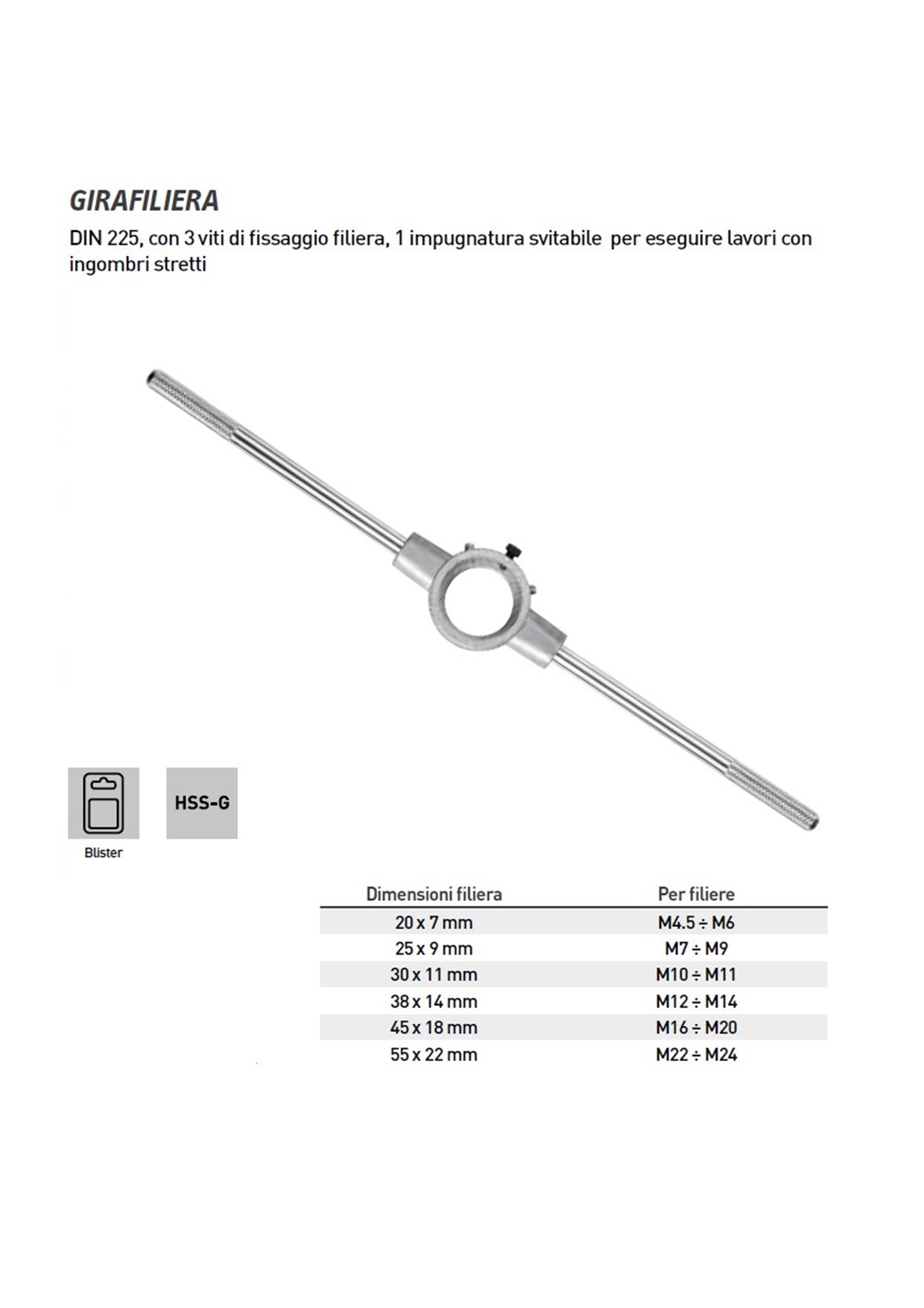 Girafiliere HSS-G con 3 viti di fissaggio filiera, 1 impugnatura svitabile per eseguire lavori con ingombri stretti. DIN 225.