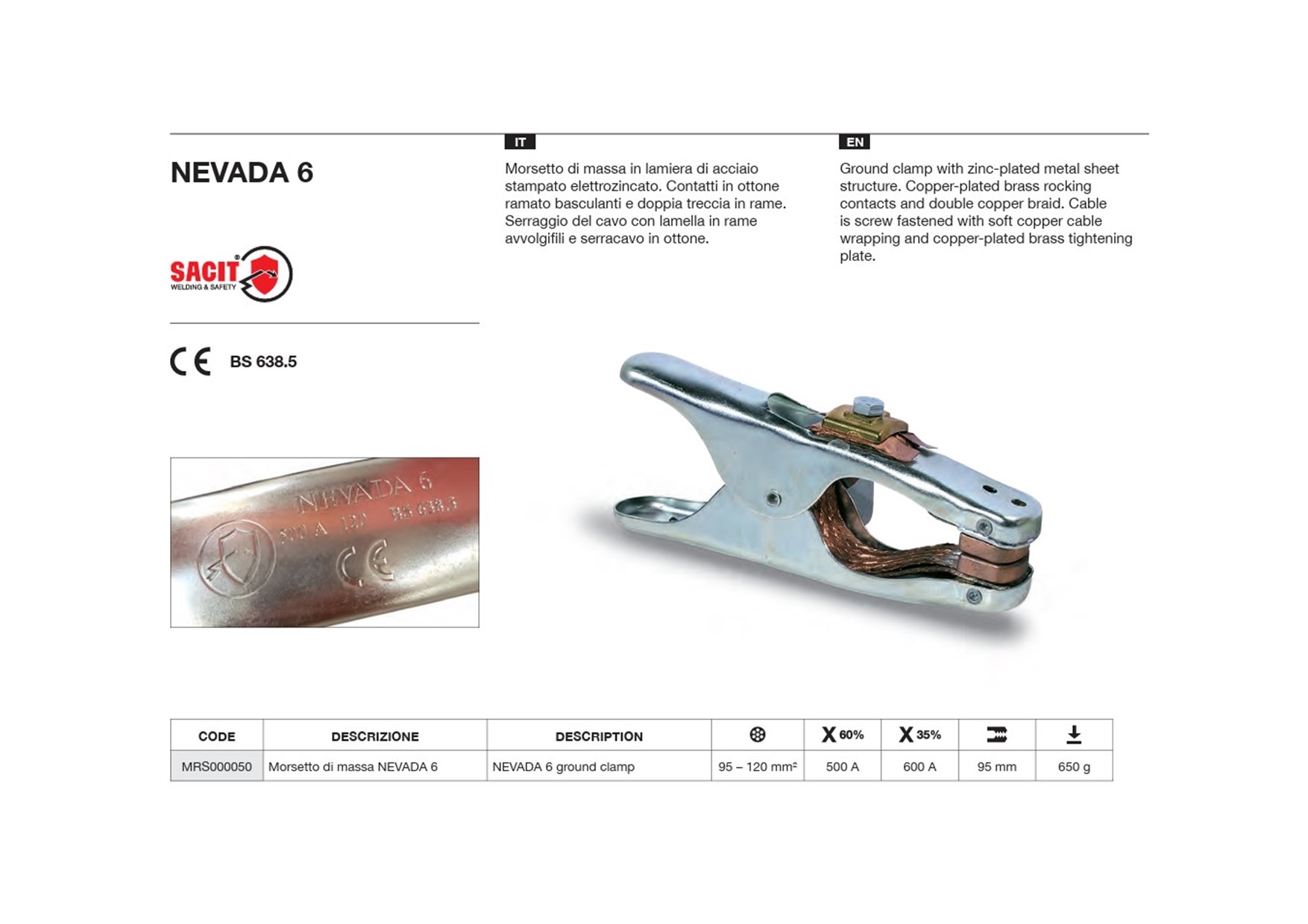 Morsetto di massa in lamiera di acciaio elettrozincato, contatti in ottone ramato e shunt in rame. Serraggio del cavo con lamella in rame avvolgiifli e serracavo in acciaio ramato. Accessorio essenziale per garantire una messa a terra efficace e sicura durante i processi di saldatura.