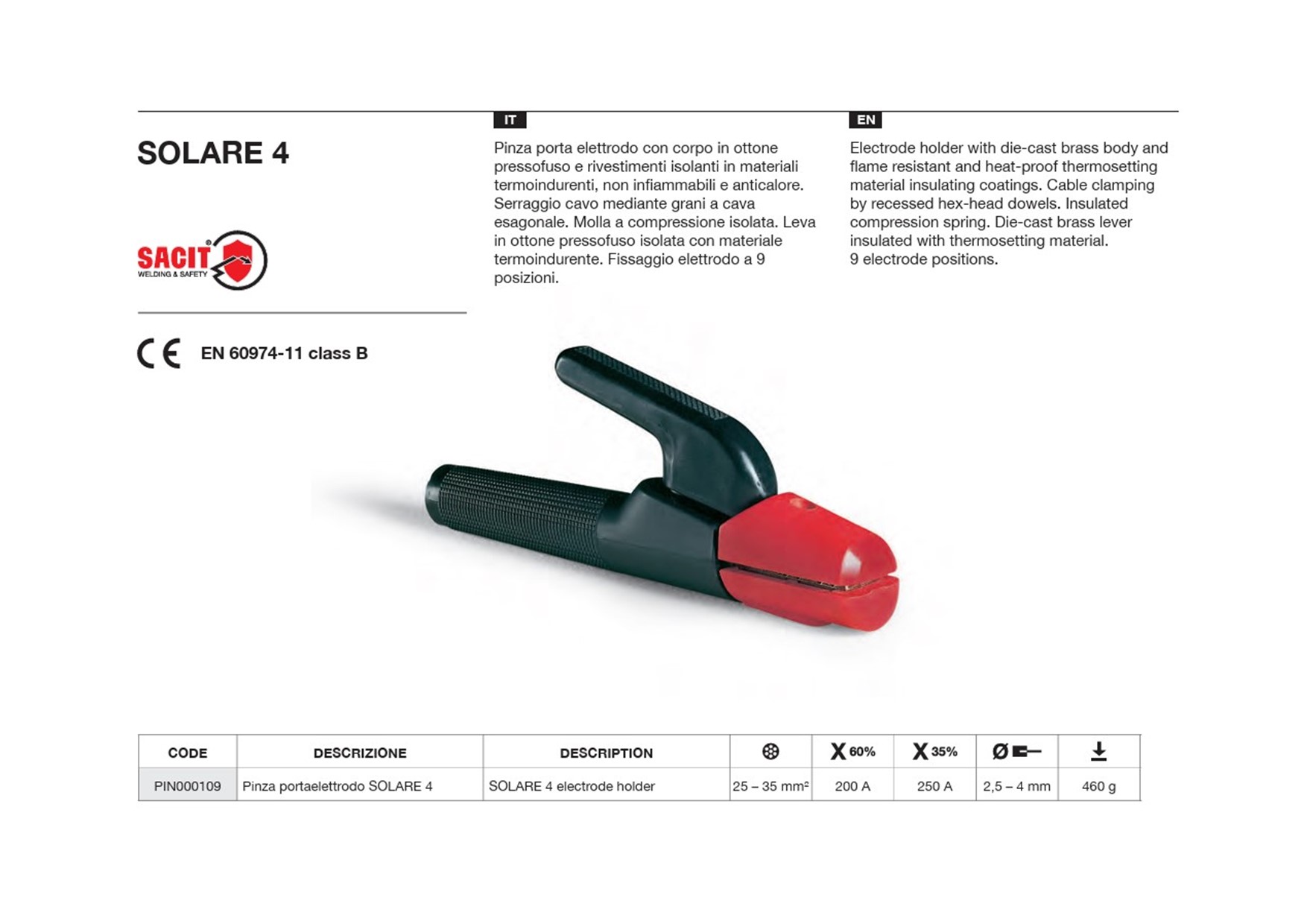 Pinza porta elettrodo con corpo in ottone e rivestimenti isolanti con materiali termoindurenti e anticalore. Serraggio cavo mediante grani a cava esagonale. Molla a compressione isolata. Leva in ottone isolata con materiale termoindurente. Fissaggio elettrodo a 9 posizini. È stata progettata per garantire un’ eccellente conducibilità e una notevvole resistenza termica. Perfetta per professionisti e hobbisti che cercano affidabilità.