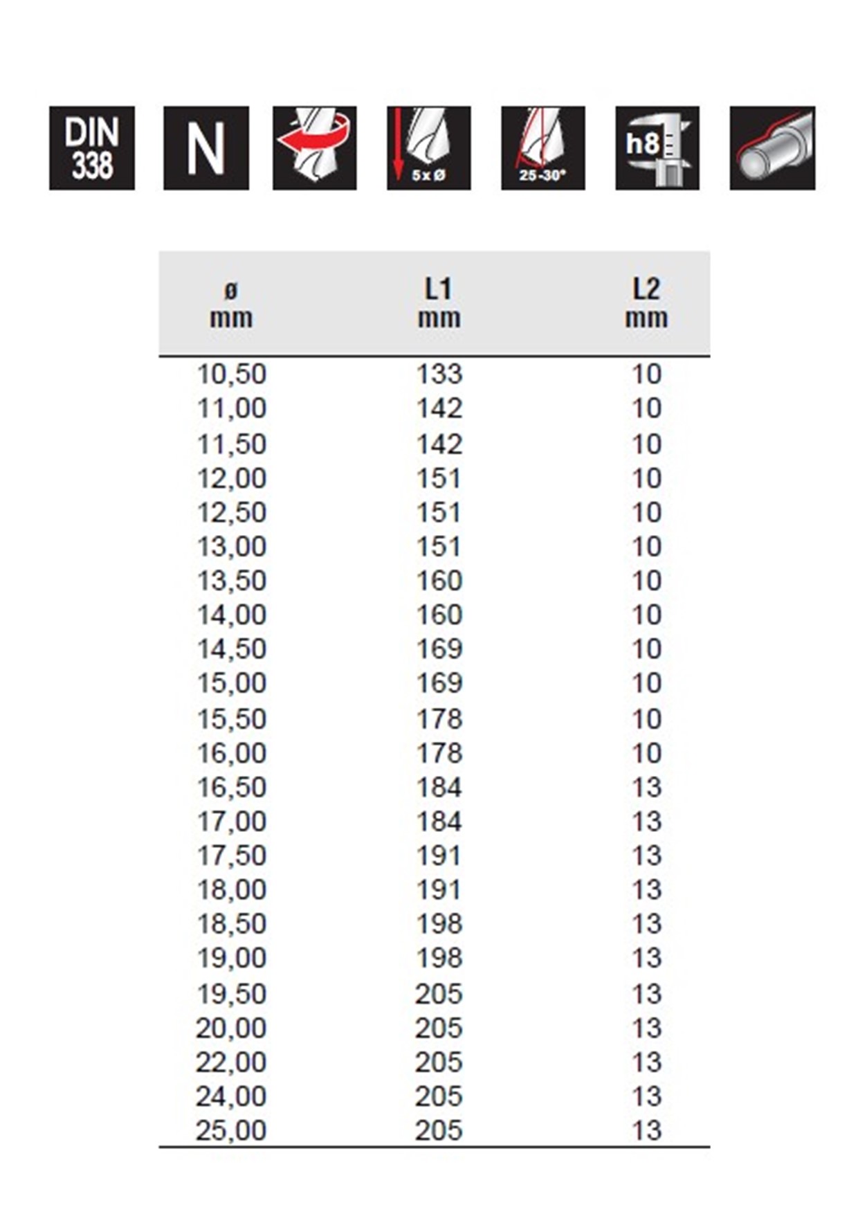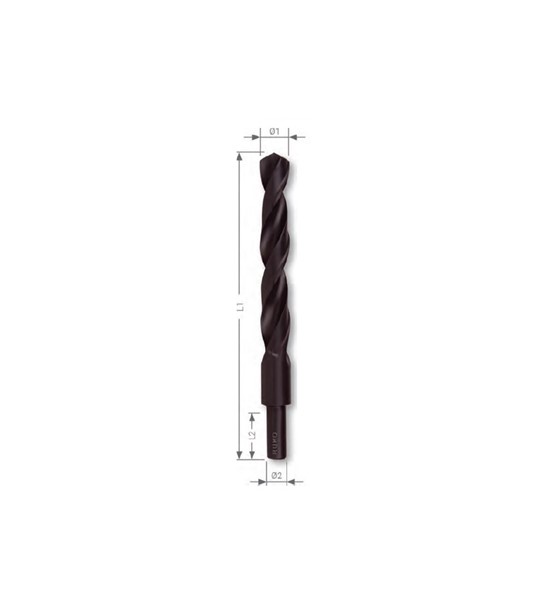 Punte RUKO rullate nere con codolo ridotto da trapano per metallo. HSS-R, DIN 338, tipo N. Punte elicoidali ad alte prestazioni, rullate e trattate a vapore, realizzate in acciaio rapido ad alta resistenza. Il processo di produzione (senza alterazioni strutturali) solidifica il materiale, rendendolo più elastico. Questo lo rende più resistente alla frattura e adatto a unità di foratura robuste (ad esempio trapani manuali). Ideale per forature di diametri maggiori su tutti i trapani comunemente utilizzati con mandrino di serraggio fino a 13,0 mm.